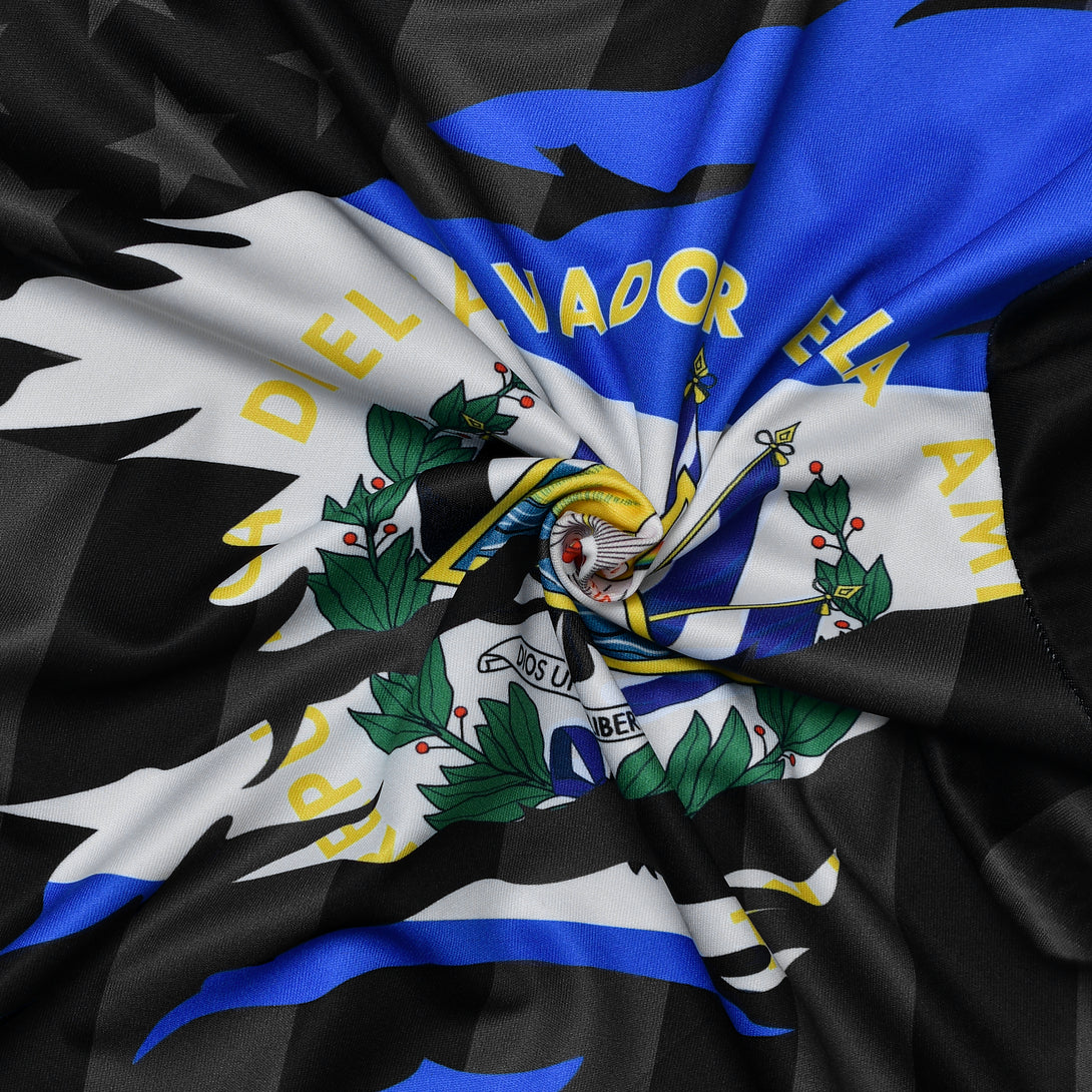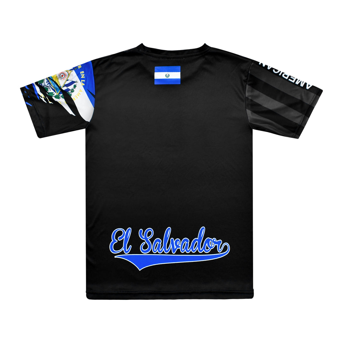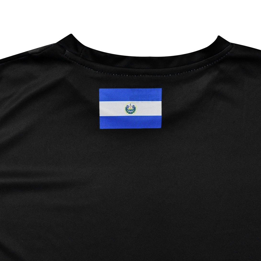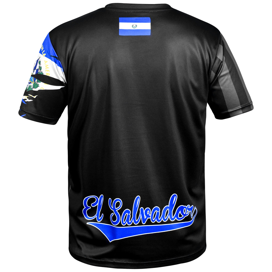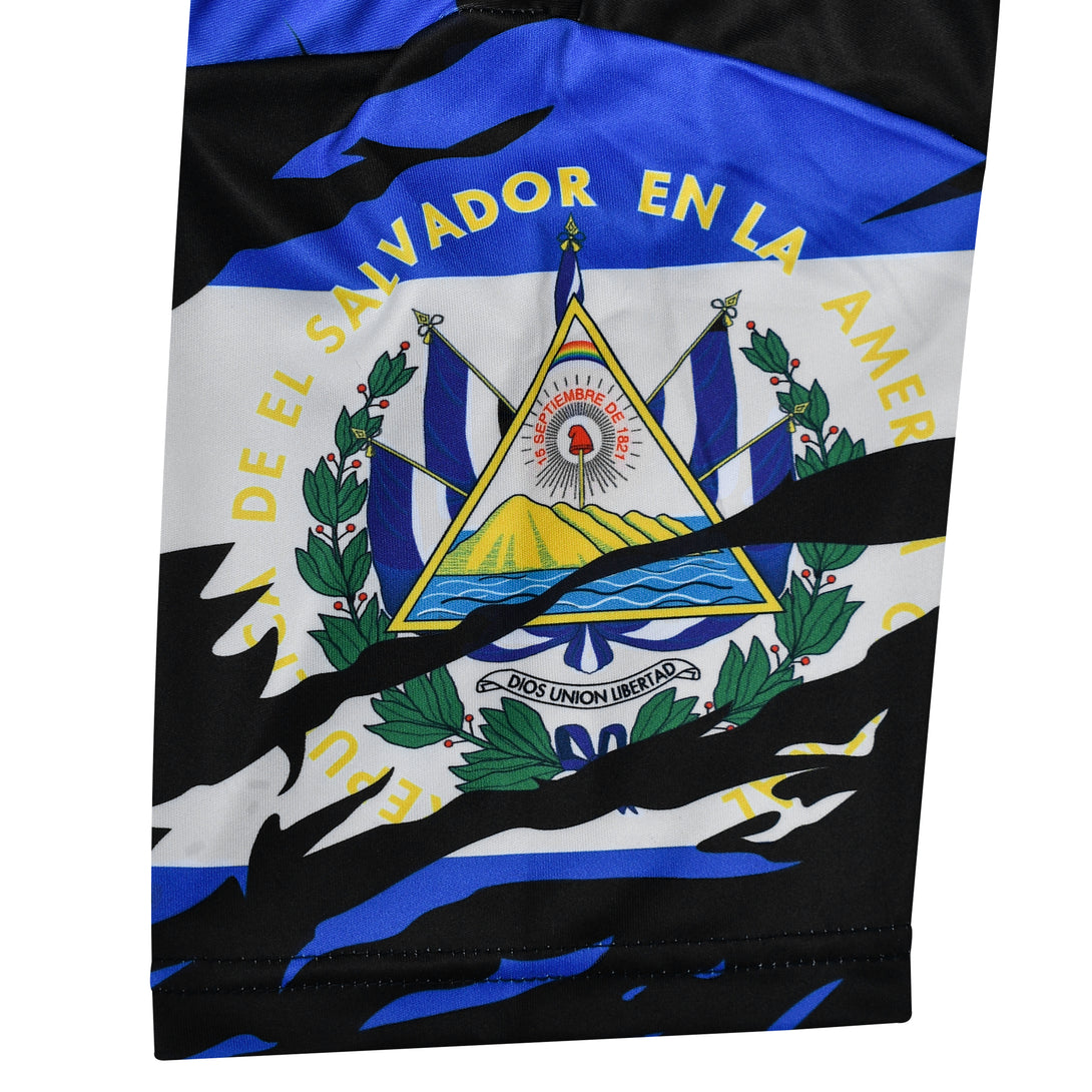 Represent your national pride with this soccer jersey featuring the colors and emblems of El Salvador.