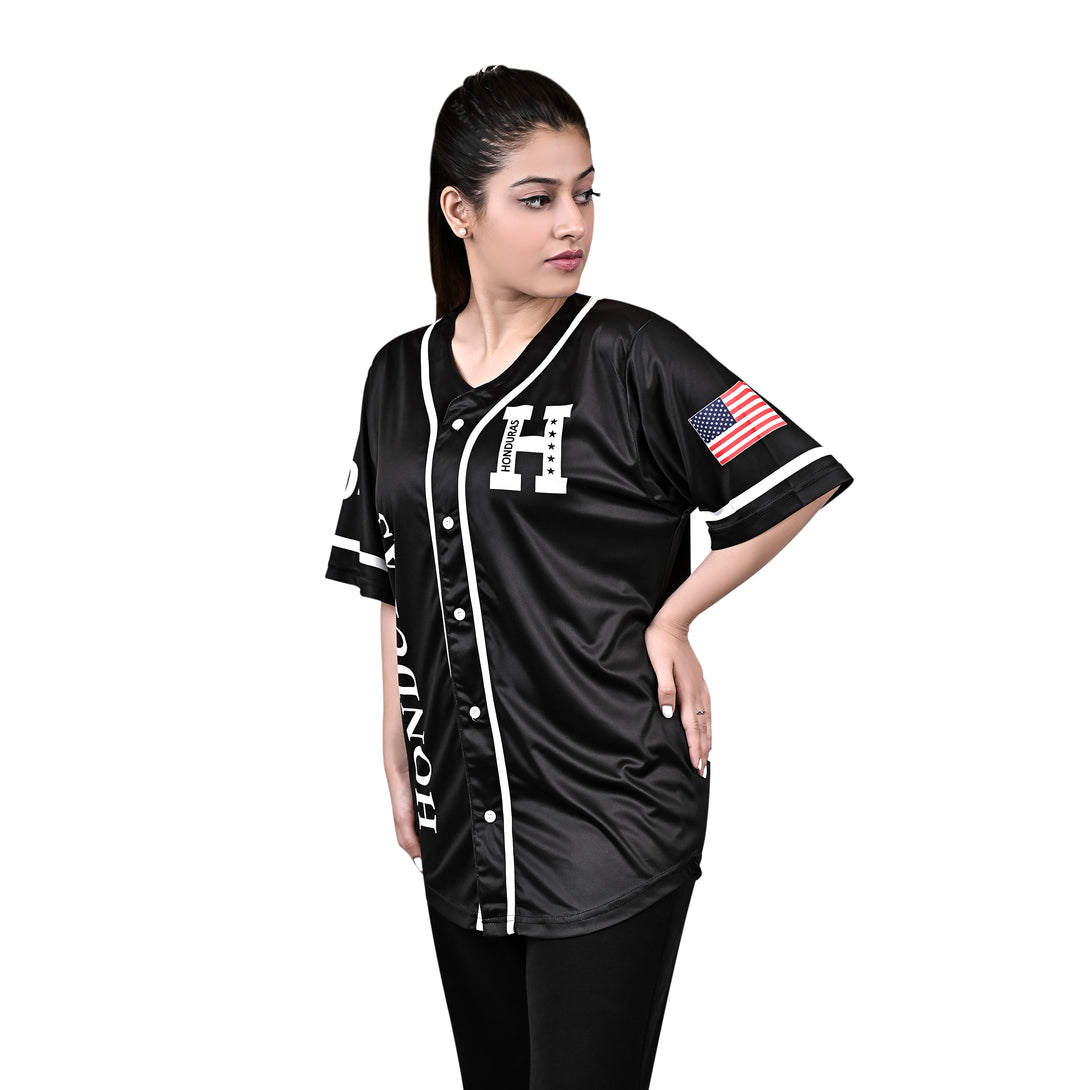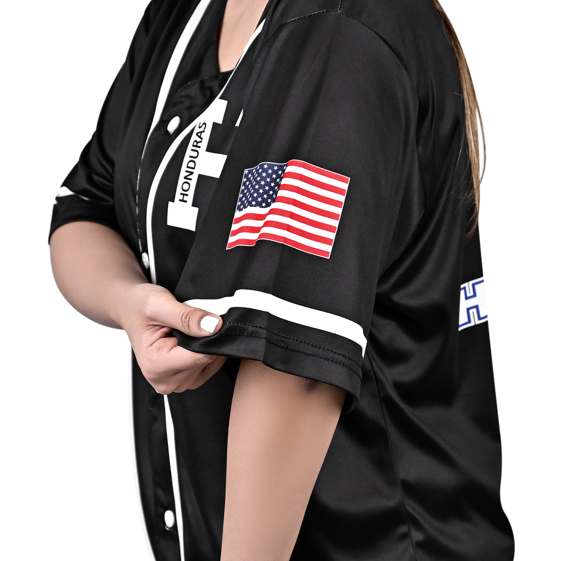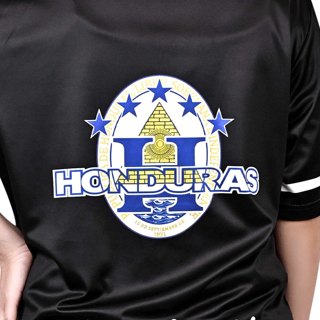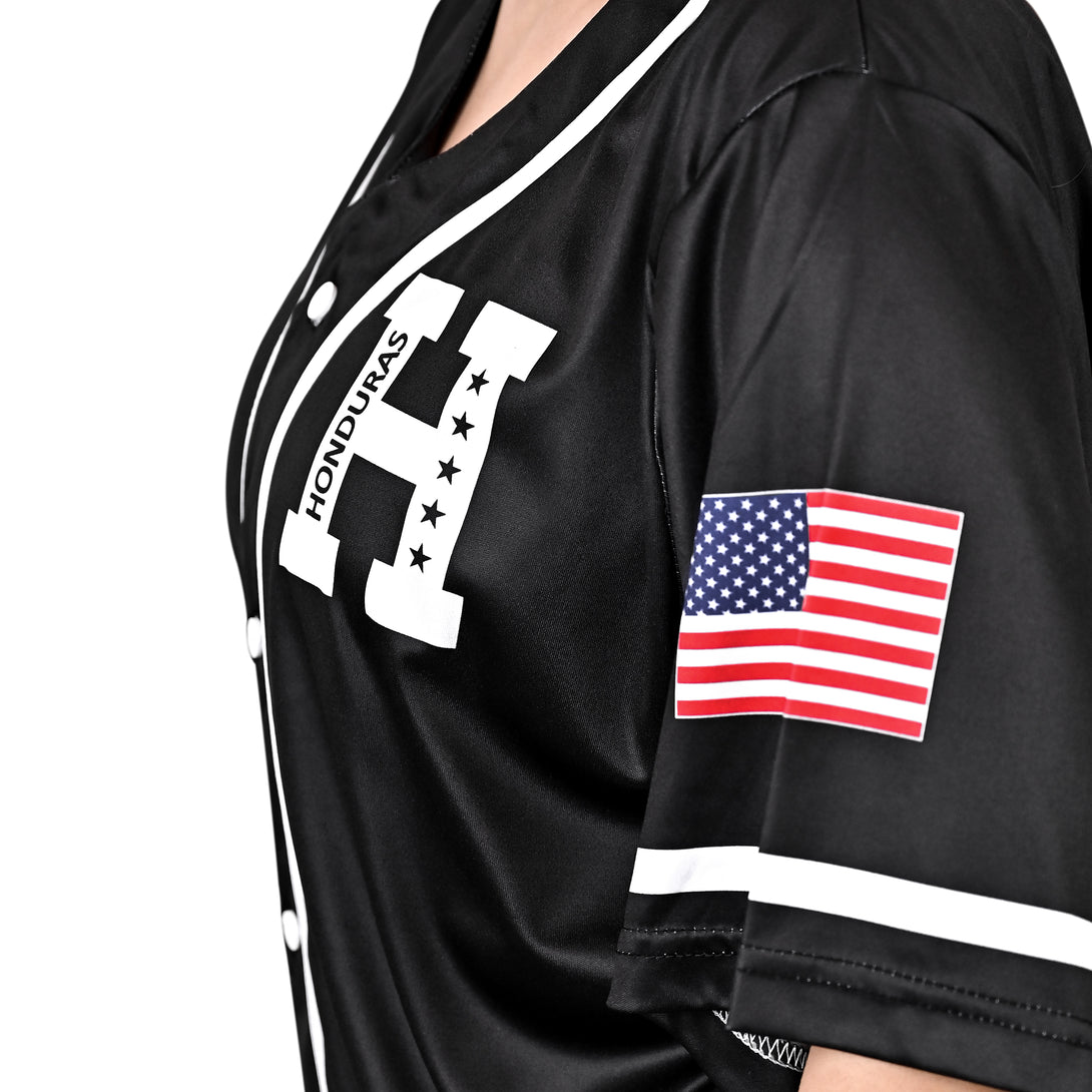 🎨 Striking Black & White Design – Button-down style with contrast piping, full-coverage prints, and dual flag accents (Honduras & USA) for a standout look.