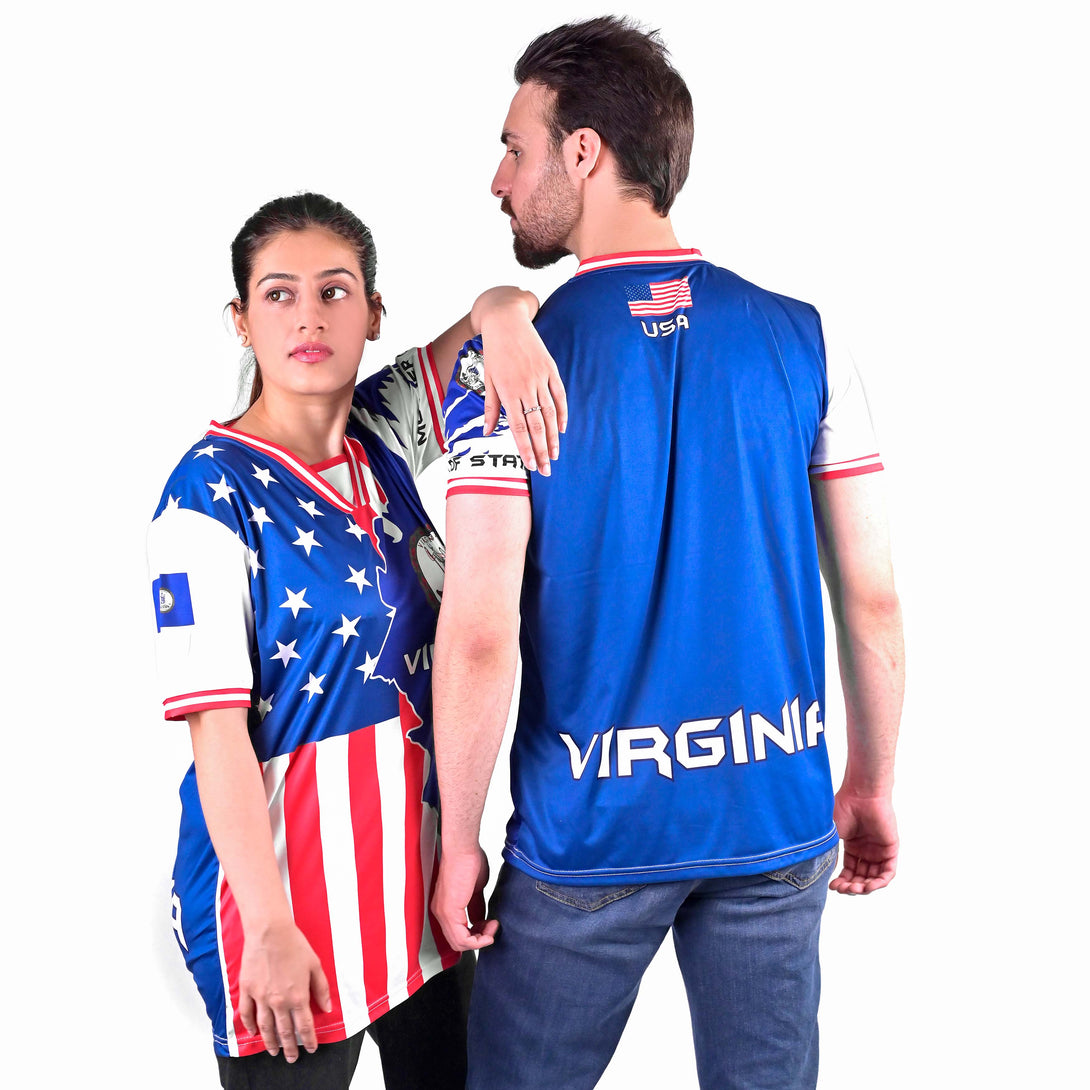 🌟 Bold Virginia Pride Design – Features a vibrant blue front with “Virginia” detailing and patriotic flag accents on the sleeves and back.